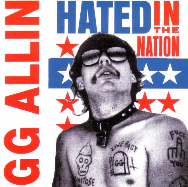 If you don’t know GG Allin, he was unabashedly violent and anti-social on purpose - he would, for example, walk on stage and smash open his own forehead with the microphone before the first song. Or he’d strip naked, defecate on stage, smear it on himself, throw it at the audience, attack anyone within reach, all total chaos, pandemonium, and repulsion instigated on purpose by him for the sake of it.