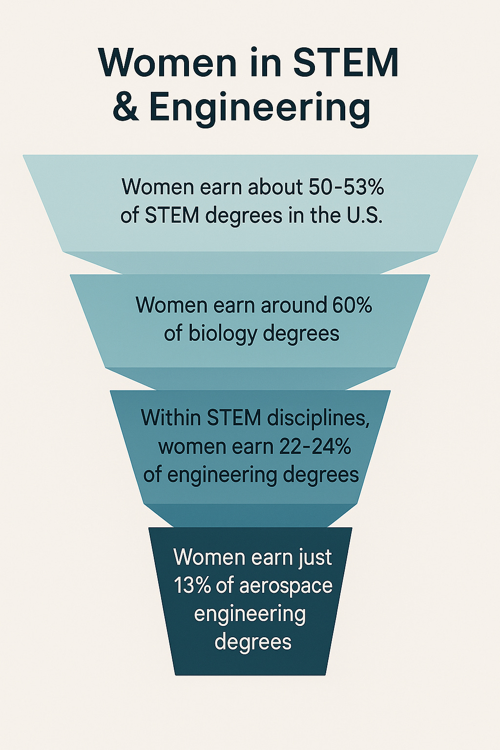 To start, women earn STEM degrees at parity, earning about 50-53% of STEM degrees in the U.S. though upon entering the workforce, women hold around only 34% of STEM jobs. That is already a 16-point drop. Within defense and aerospace, women are just around 20–25% of that workforce which means another 10–14 point drop.