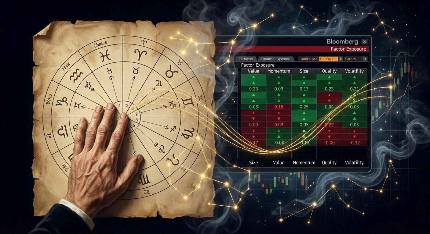 The astrologer asks where Mars was when you were born. The quant asks what your volatility exposure is. Both believe the arrangement determines what comes next.