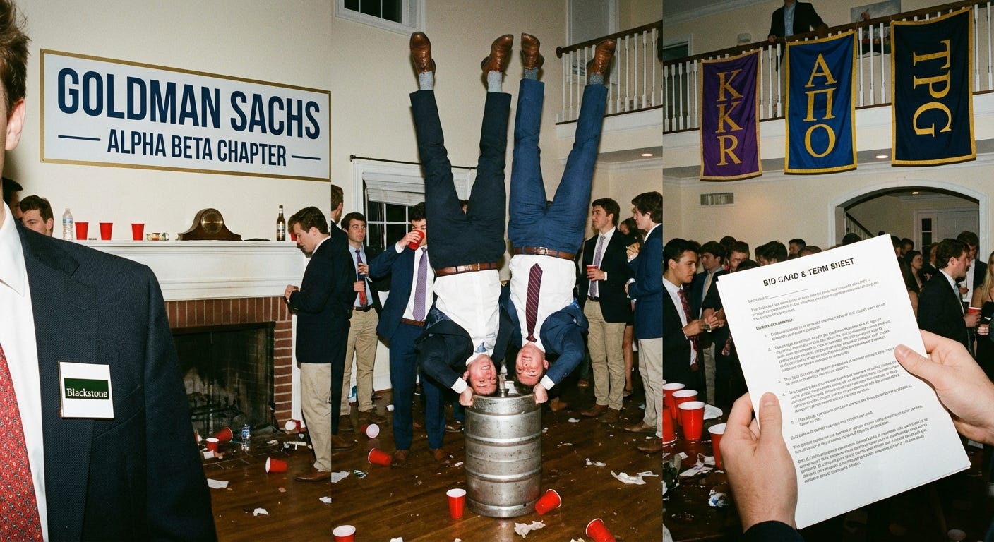So why the frenzy, why the rushing, why the insanity that mirrors Greek life on university campuses? American PE runs on a fraternity-to-firm pipeline. I’ll state the obvious - it is not about meritocracy, it is about class and social reproduction.