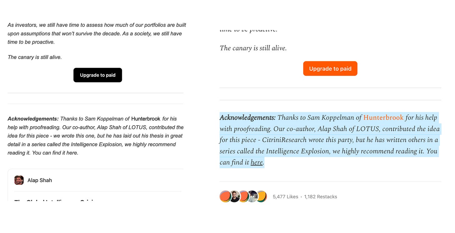 While it’s giving a little bit of “babe, they’re just a friend, don’t worry”, there’s more. The same directional shift in language for the pre-face appears in the acknowledgements. The original email sent to Citrini subscribers reads “Our co-author, Alap Shah of LOTUS, contributed the idea for this piece - we wrote this one.” Now, the website shows an edit to just saying “CitriniResearch wrote this party”