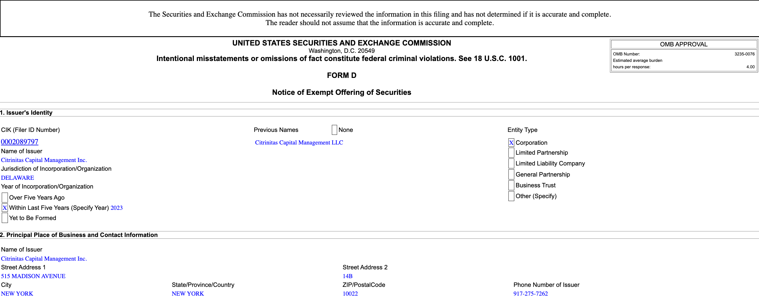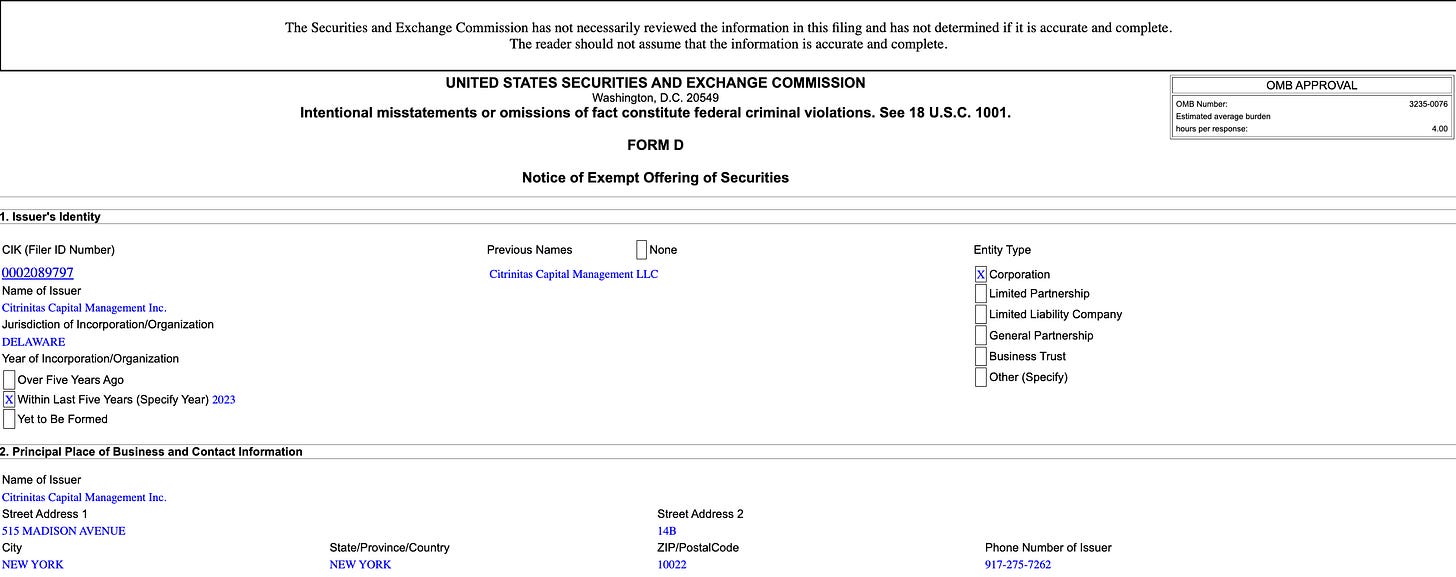 The public record showed Citrinitas Capital Management Inc. (CIK 2089797), a Delaware corporation doing business as Citrini Research and Citrindex, raised $5,050,000 from five investors through SAFE notes under Reg D Rule 506(b). Its site described the entity at the time as “an asset management and investment research firm” that “is not a broker-dealer or investment advisor” and “does not owe a fiduciary duty”.