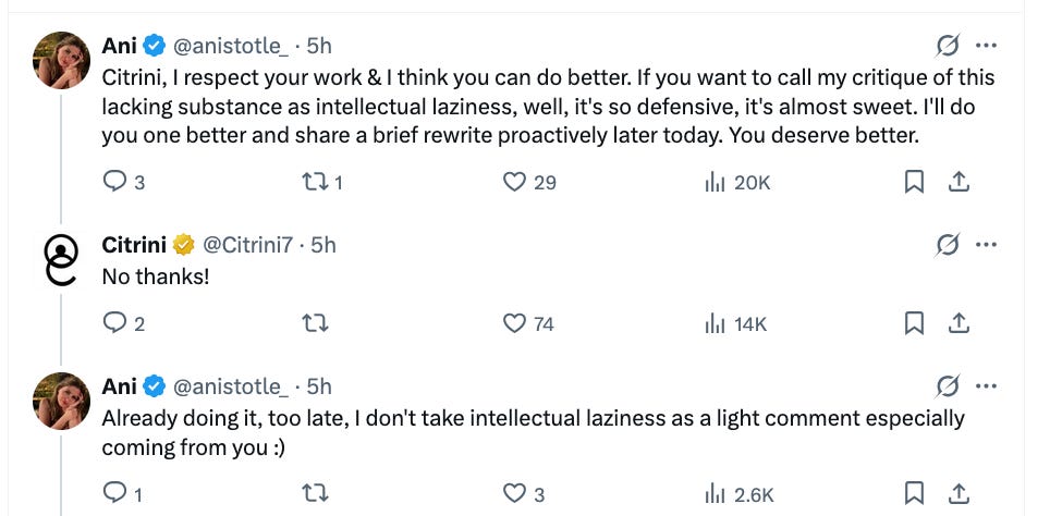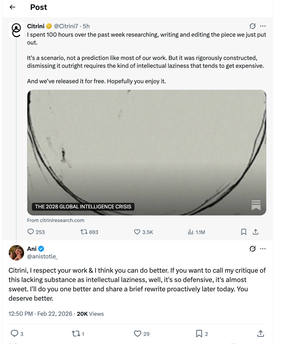 According to Citrini, 'dismissing it outright requires intellectual laziness that tends to get expensive.' This was in his original post, before I ever commented. He set the terms: critique equals laziness. Obviously I didn't dismiss it, but Citrini tells himself one story that makes a critique about the form of the writing from an unknown writer palatable and then blocks me for offering the rewrite. Professional decorum and standards of judgement are fluid, but blocking a 2,000-follower account for engaging seriously with your work through a rewrite that reflects your own ideas and research is not the flex of a man confident in his craft.
