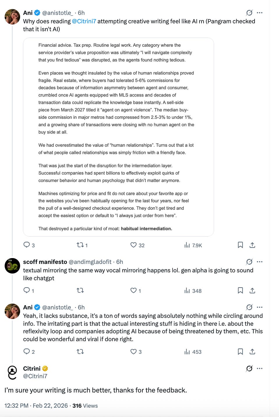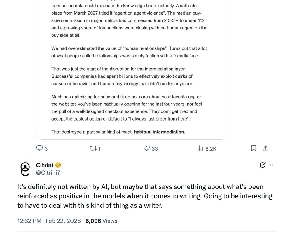 The research is his. It's good research. It has good ideas. But finding and having the information is never the hardest part, though it is tedious and requires effort - making someone feel it is. He spent 100 hours writing a piece about the end of the world and even though it isn’t AI, it reads like in parts and structures. At best, you can attempt to advance that AI is calibrating for writing like this. At worst, I’ll let you fill in the blanks. But there’s something far more interesting going on here than a fintwit beef over an opinion on style: what do we consider substance, what is style, and what are our standards for good taste, engagement, and intellectual honesty in the era of AI slop? My rewrites reflect what I think involves a kind of narrative cohesion, cadence, and care for the topic that reflects a through-line between the theme and the narrative of it. That being said, someone reading this could think my writing is garbage, Citrini’s is better, or that Citrini’s writing is garbage, mine’s is better, or that efinancialcareers.com is the best, we are both mid, etc. It isn’t about what is better or best or be best as our First Lady would say. It is about the love of the game and using one’s brain to be true to it. All of this being an intriguing exercise for an otherwise sleepy Sunday, I’ll end it on this note - intriguingly, Citrini offered of his own volition the following comments.