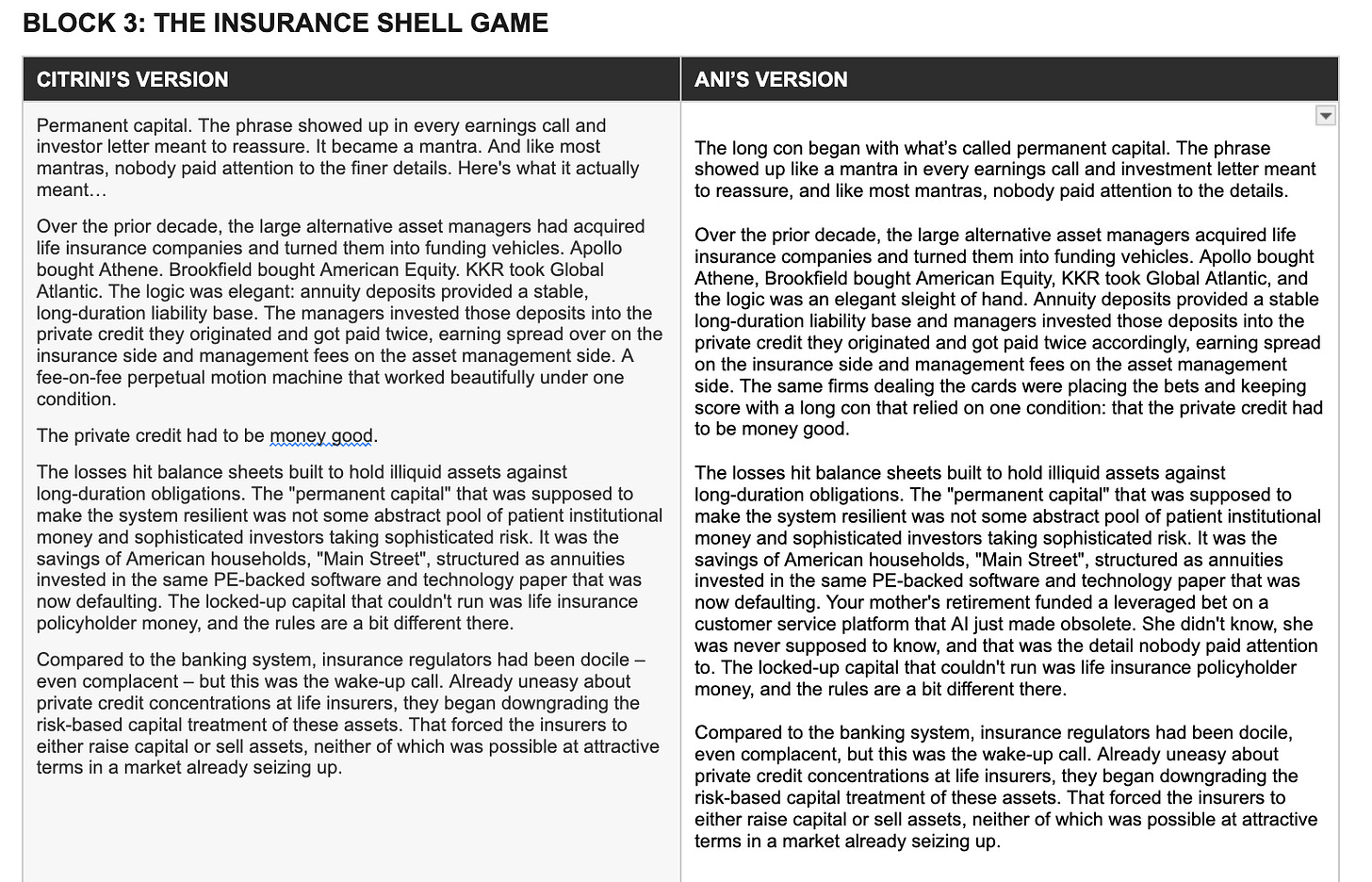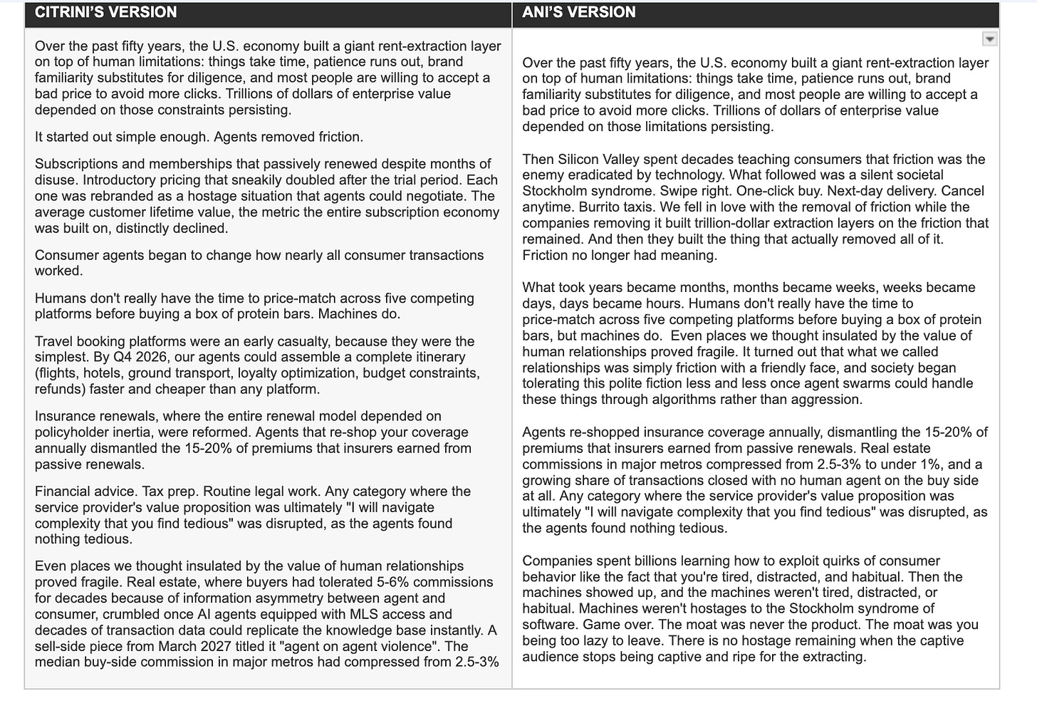 Some selected blocks from Citrini’s original report side by side with my rewrites as a case study, for the love of the game, and simply because it is fun to challenge oneself and grow to become a better writer. You can have the best research in the world, you can have all of the intel, but substance and style are a never-ending project. Sometimes the sycophantic echoes slow you down in your growth.